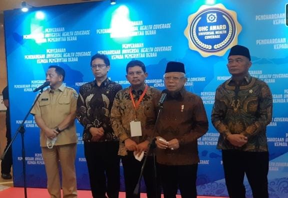 JAKARTA – Potensinusantara.co.id (14/03/2023) – Wakil Presiden Republik Indonesia Ma’ruf Amin memberikan penghargaan kepada 22 Provinsi, 334 Kabupaten dan Kota yang telah mendukung Program Jaminan Kesehatan Nasional-Kartu Indonesia Sehat (JKN-KIS) sebagai program strategis nasional dengan mendorong terwujudnya Cakupan Kesehatan Semesta atau Universal Health Coverage (UHC) di Indonesia. Dengan tercapainya UHC di setiap daerah, Wapres juga mengapresiasi komitmen Pemda khususnya dalam melaksanakan Instruksi Presiden Nomor 1 Tahun 2022 tentang Optimalisasi Program Jaminan Kesehatan Nasional (JKN).