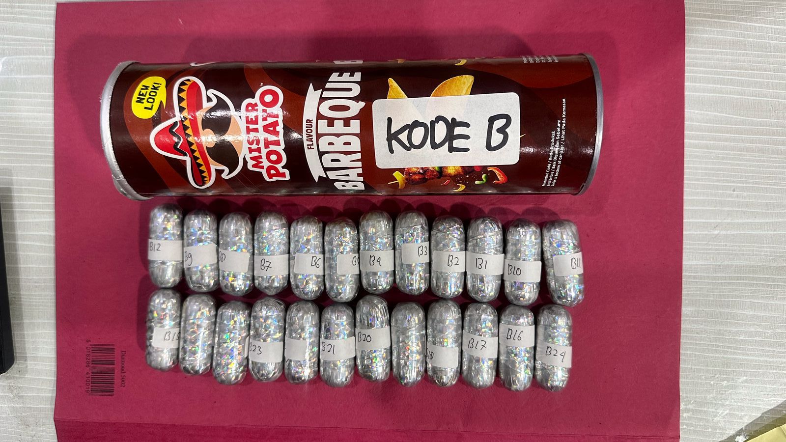 Saat digeledah, polisi menemukan dua kaleng coklat berlogo Mister Potato yang berisi 50 kapsul besar berisi sabu dengan berat total 577 gram.